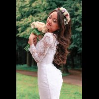 Чудесный образ для Марии, макияж в серо-сиреневых тонах, достаточно яркий и насыщенный, прическа из кудрей оформлена венком.