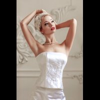 Длинные волосы собраны в высокую элегантную прическу, макияж с яркими красными губами, но в тоже время и глазки не оставлены без внимания засчет стрелки и ресничках в пучках.