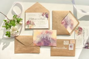свадебные приглашения, приглашения на свадьбу в крафт конверте, цвета свадьбы сиреневый и желтый, акварельные приглашения, стильная свадьба, необычная свадьба, пригласительные в европейском стиле, приглашения с инициалами молодоженов, конверт с марками