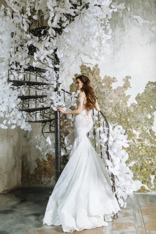 Модель Диас. Платье А-силуэта из шелкового микадо, поверх декольтированного платья с прямым срезом корсета одевается жакет из кордового кружева. Юбка в бантовую складку сзади переходит в шлейф средней длины, в боковых швах спрятаны кармашки. Волшебная мод