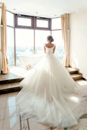 утро невесты, сборы невесты, платье невесты, пышное платье, шлейф, отель