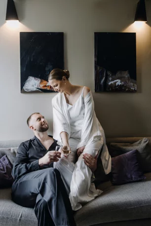 свадебное утро, молодожены, бокалы игристого, стильная пара
