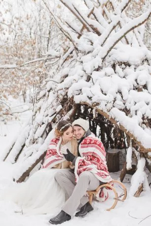 Свадьба, невеста, жених, платье, костюм, шубка, снег, букет, зима, красота, нежность, санки