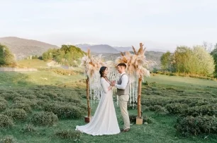 Церемония бракосочетания на природе в обрамлении старинного резного наличника и легких воздушных тканей.