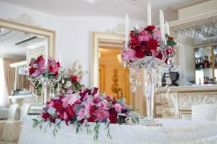 свадебный стол, декор, фотозона, гранат, красный, цветы в декоре, флористика