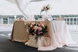 президиум, стол молодых, оформление шатра, свадьба на воде, шатер, свадьба в шатре