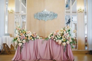 Мы очень любим воздушные юбочки на столы молодоженов. Посмотрите, как струится ткань, будто розовый туман окутывает нас и создает настроение