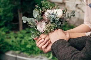 Букет для невесты в розово- бардовых цветах, в сочетании с синим в одежде пары