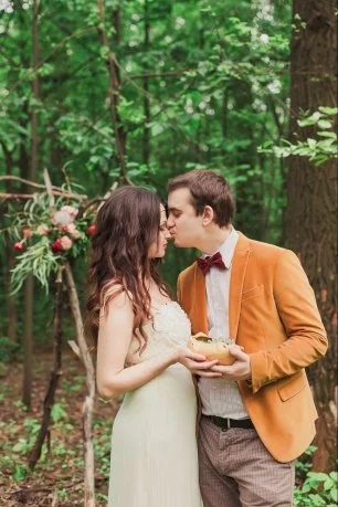 свадьба, эко стиль, невеста, жених, поцелуй, терракотовый пиджак, бабочка, фотосессия в лесу, эко свадьба, подставка для колец