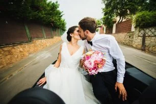 Свадьба в Испании, Свадьба в Барселоне, свадьба за границей, поездка на автомобиле, экскурсия, свадьба, путешествие, букет, поцелуй