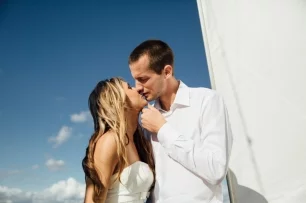 яхта, прогулка на яхте, невеста, жених, свадебное платье, поцелуй