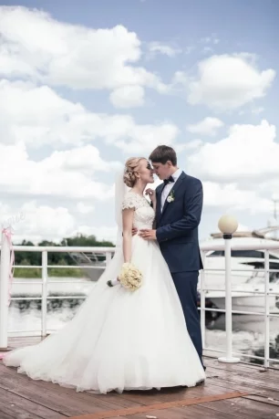 Красно-белая сердечная свадьба Дмитрия и Ольги, жених и невеста держат в руках гирлянду из флажков