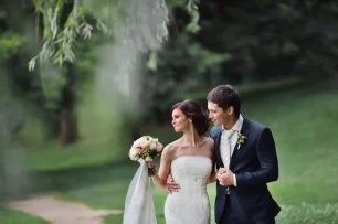 Свадьба, лето, зелень, прогулка, цветы в прическе, бутоньерка