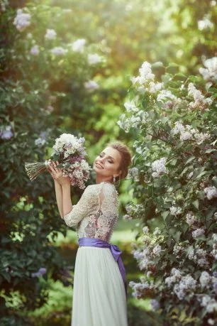 букет невесты, платье, сирень, сиреневая свадьба, портрет невесты, ботанический сад, прогулка