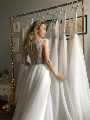 Свадебное платье стильное, Свадебное платье с длинным шлейфом, Свадебное платье пышное, Свадебное платье с перьями, Свадебное платье с ручной вышивкой, Свадебное платье без рукавов, Свадебное платье с вырезом, Свадебное платье с глиттером