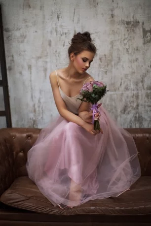 Студийный образ для фотосъемки сборов невесты в будуарном платье
