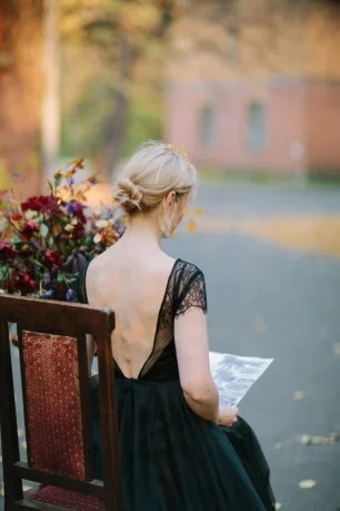Собранная прическа невесты, платье невесты без бретелей, книга в свадебном декоре, большой бант на платье