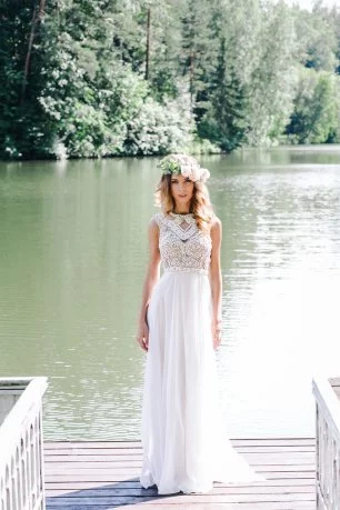Оригинальное свадебное платье, топ которого расшит объёмным кружевом с вкраплениями золотой нити. Поясок из стразов выгодно подчёркивает талию, а обрамлённый камнями лиф — линию декольте.