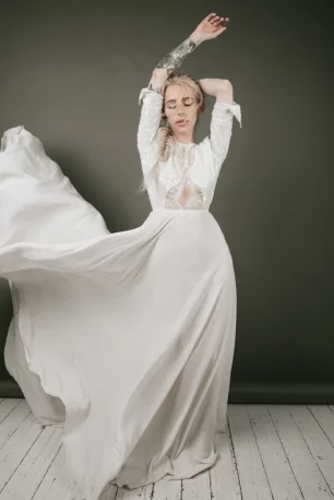 шелковое свадебное платье, свадебное платье из шелка, дизайнерское свадебное платье, свадебное платье с декольте, летящее свадебное платье, легкое свадебное платье, современное свадебное платье