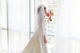 Утро невесты, свадебное платье без бретелек, длинная фата, букет невесты с розами и пионами, платье невесты, букет, пионы