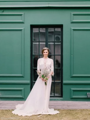 Невесомое свадебное платье цвета «пыльная роза» из шифона и нежной сетки, расшитой кружевом шантильи