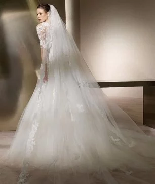 Платье невесты с длинным шлейфом и кружевной отделкой