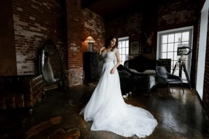 Свадебное платье с красивой спиной, декорированной брошью в виде бабочки