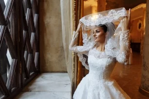Закрытое свадебное платье в стиле Принцесса. Модель №147. Вид застежки корсета: молния, шнуровка. Корсет платья выполнен из атласа.