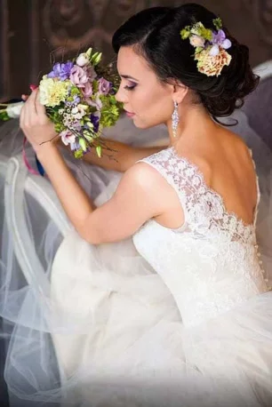 нежный образ, пудровое платье невесты, диадема, невеста, свадебная прическа, кружевная спинка, образ невесты