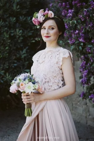 цветное свадебное платье, розовое свадебное платье, образ невесты, кружево